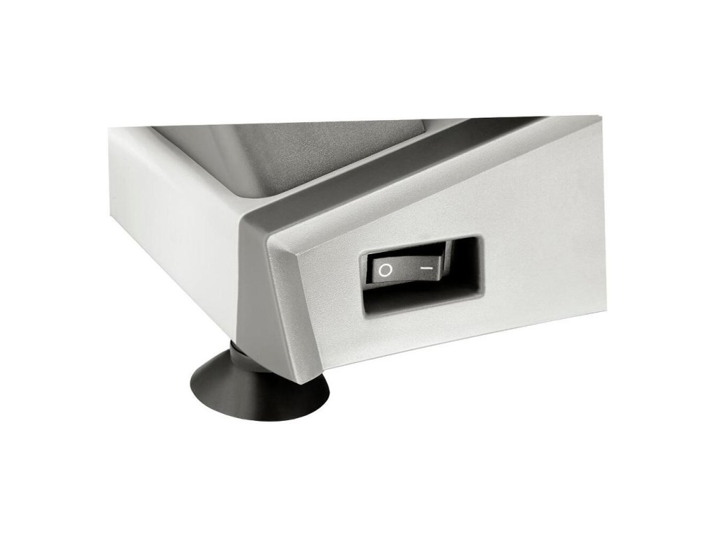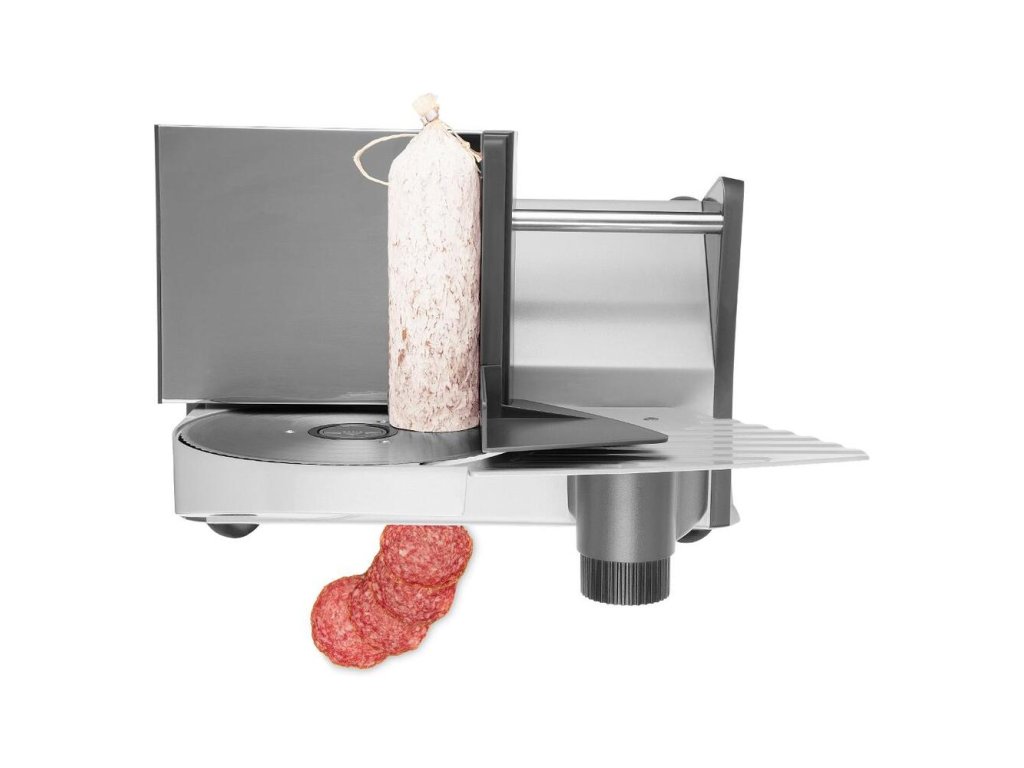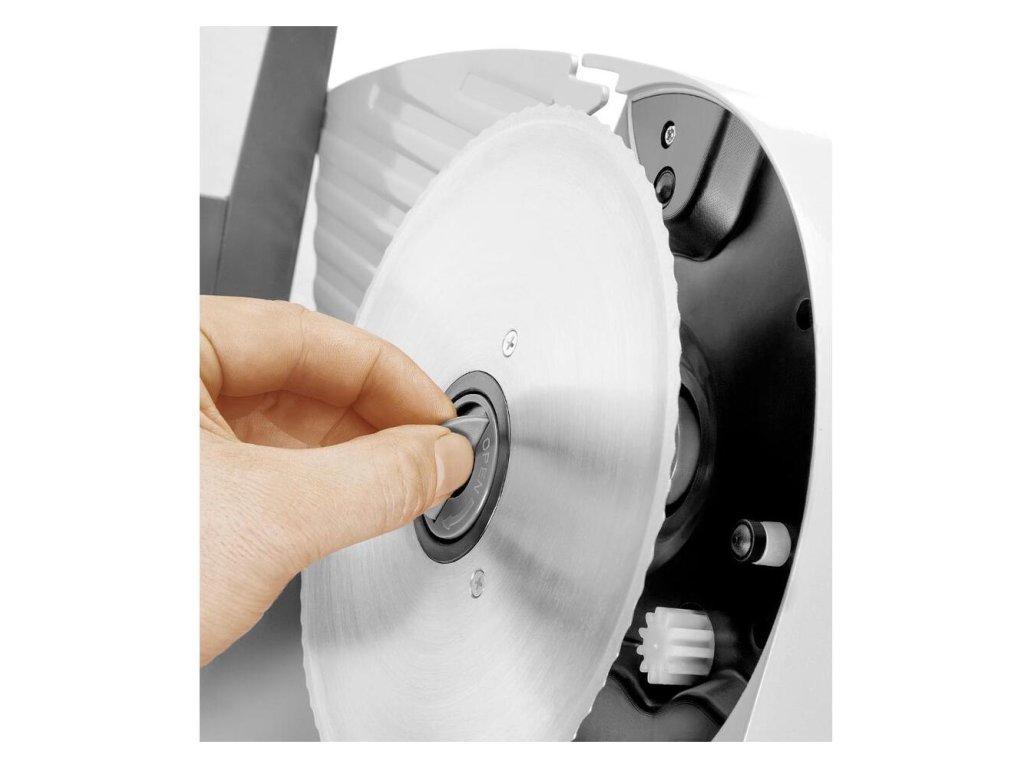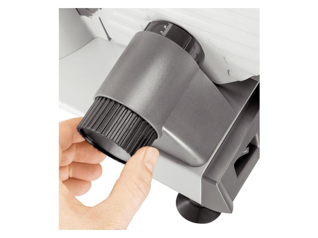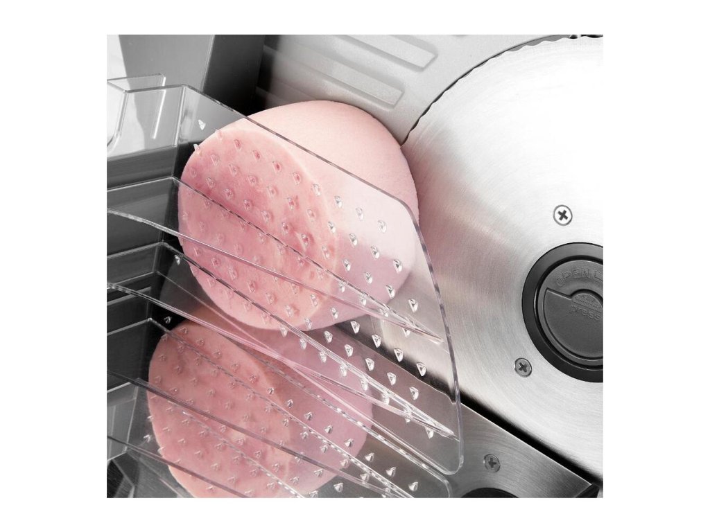 odnímateľný pojazd s dorazom v oboch smeroch a prítlačný podávač so záchytnými tŕňmi proti nechcenému posunu potravín pri krájaní. Nechýba integrovaný chránič palca, priestor na uskladnenie sieťového kábla a protišmykové nožičky.