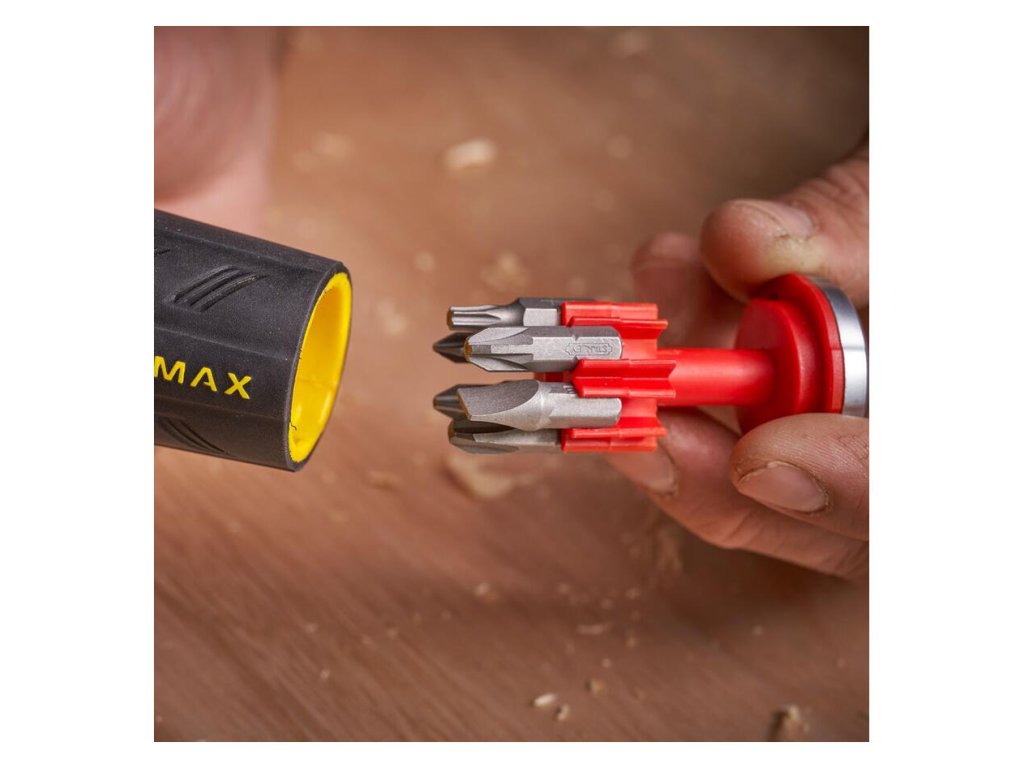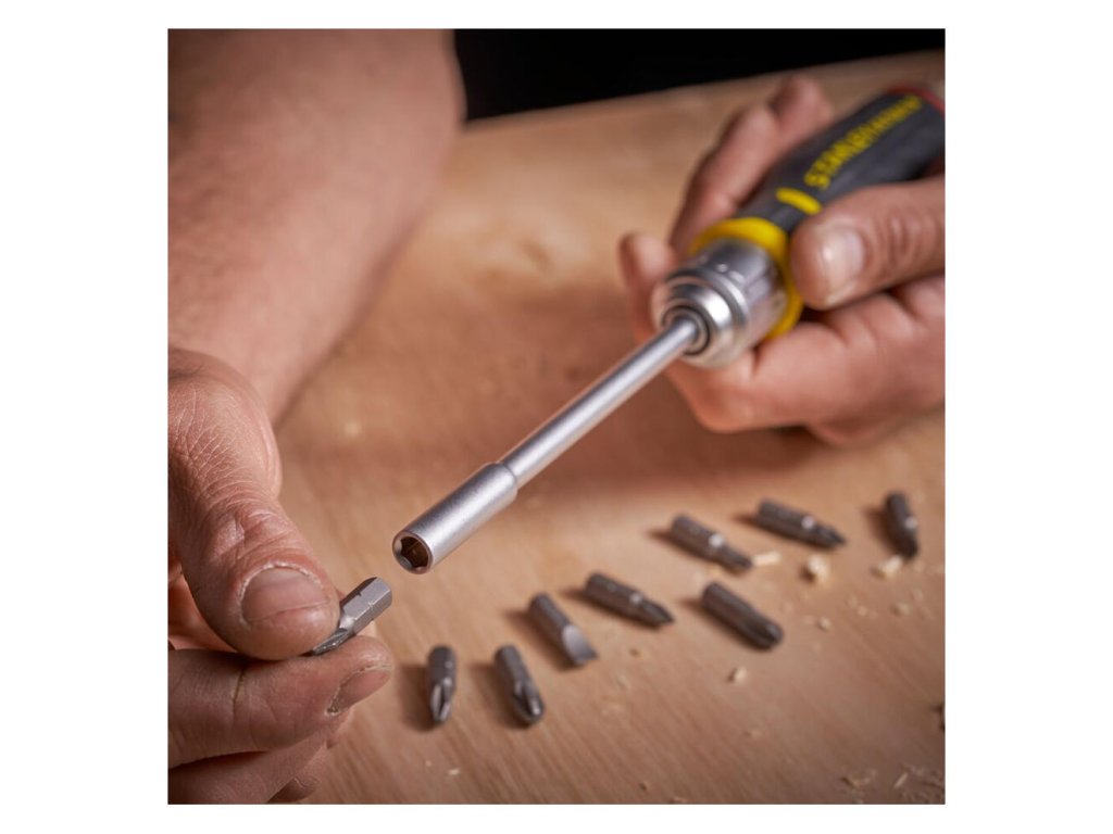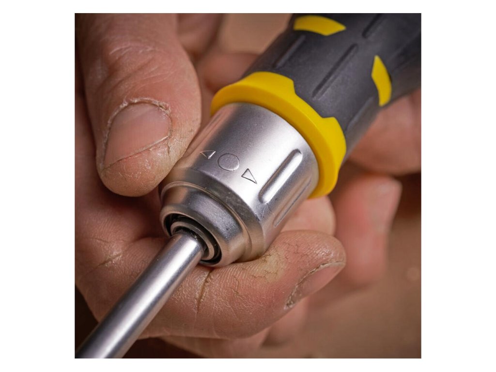 7-dielny set Stanley 0-66-358 s multibitovým račňovým skrutkovačom (s aretáciou) a 6 bitmi (Phillips, Pozidriv, ploché). Magnet v drieku...