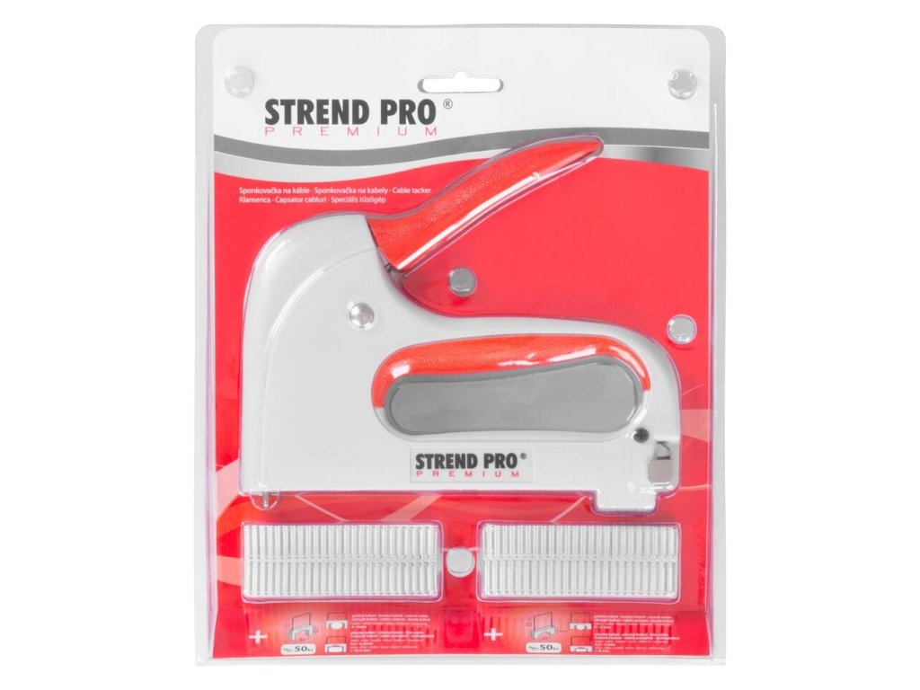 Ručná sponkovačka Strend Pro je určená na spájanie káblov pomocou sponiek. Je to robustný a pevný nástroj, s ktorým ľahko pripevníte káble, elektrické vodiče, šnúry či audiokáble. Vhodná pre spony typu A. Balenie obsahuje aj 50 ks sponiek na guľatý kábel:6-8 + 4-6 mm a 50 ks sponiek na plochý kábel: 4,5-6,3 + 2,5-4 mm.