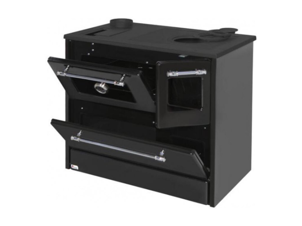 Sporák disponuje varnými platňami, regulátorom prívodu vzduchu a prúdenia tepla, praktickými dvierkami ohniska a dvierkami rúry na pečenie.