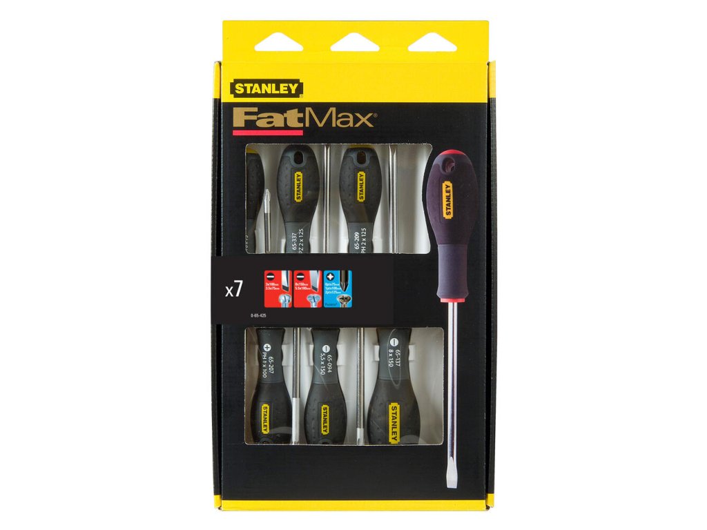 7-dielna sada skrutkovačov Stanley 0-65-425 FatMax je navrhnutá pre vysoký krútiaci moment a odolnosť. Sada obsahuje ploché paralelné a štandard, a krížové Pozidriv skrutkovače. Drieky z chróm-vanádiovej ocele sú vstrekované priamo do rukovätí pre nerozbitné spojenie. Veľký priemer rukoväte s mäkkým gumovým povrchom a zaobleným koncom zaisťuje pevné uchopenie a rýchle pretáčanie.