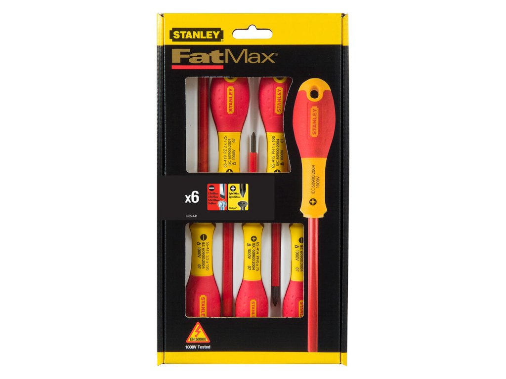 6-dielna sada izolovaných skrutkovačov Stanley 0-65-441 FatMax je určená pre bezpečnú prácu na zariadeniach pod napätím do 1000 V (testované na 10000 V podľa EN 60900:2004). Driek je z chróm-vanádiovej ocele s odolným polyamidovým izolačným povlakom. Ergonomicky tvarovaná rukoväť zaisťuje vysoký krútiaci moment. Sada obsahuje tri ploché paralelné a dva krížové Phillips skrutkovače, plus Volt-tester.
