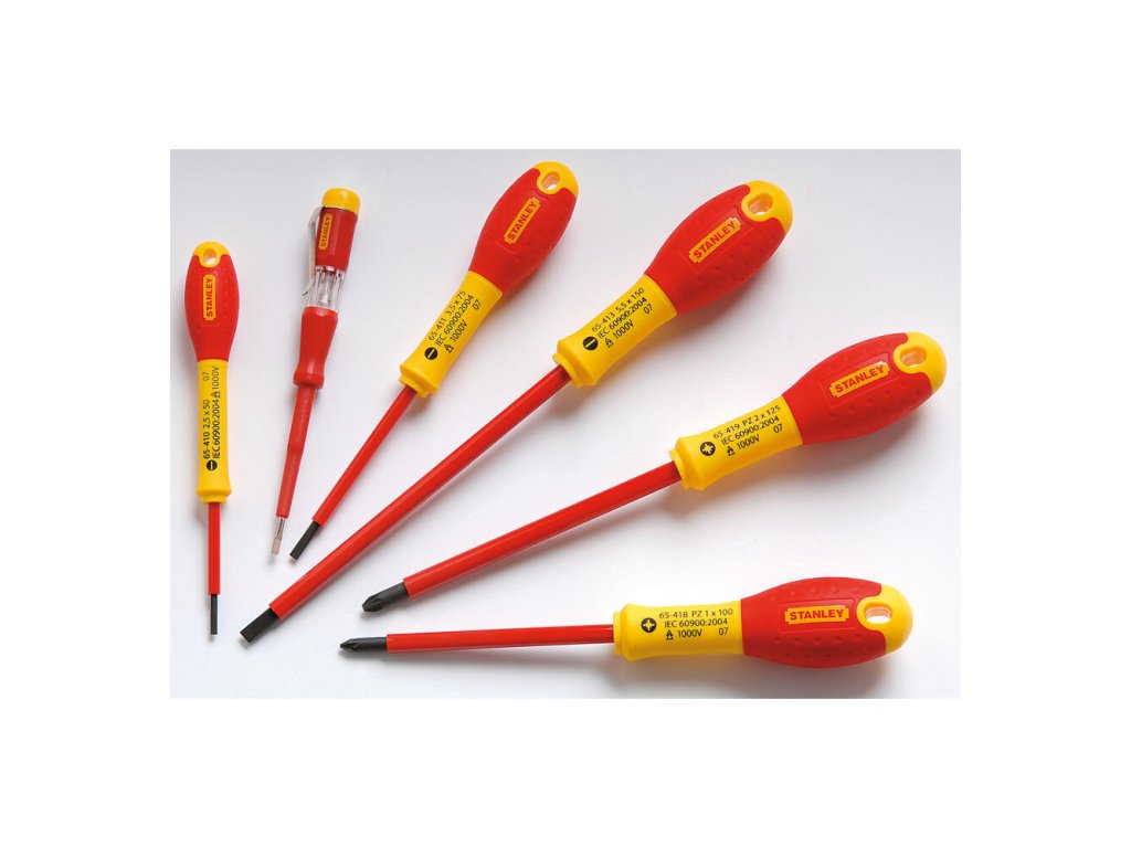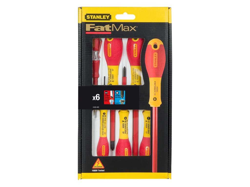 6-dielna sada izolovaných skrutkovačov Stanley 0-65-443 FatMax je určená pre prácu na zariadeniach pod napätím do 1000 V (testované na 10000 V podľa EN 60900:2004). Driek je z chróm-vanádiovej ocele s odolným polyamidovým izolačným povlakom. Ergonomicky tvarovaná rukoväť zaisťuje vysoký krútiaci moment. Sada obsahuje tri ploché paralelné a dva krížové Pozidriv skrutkovače, plus Volt-tester.