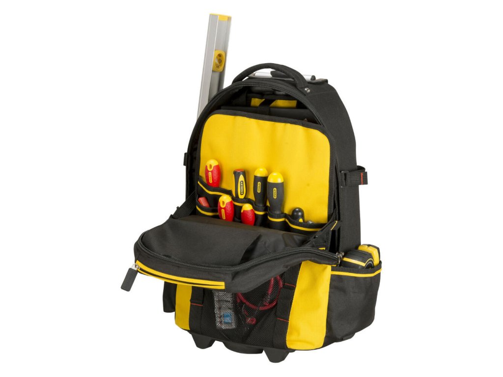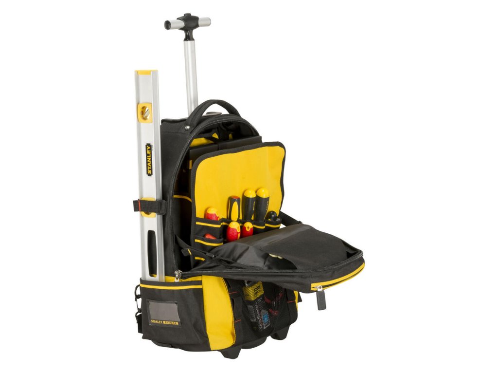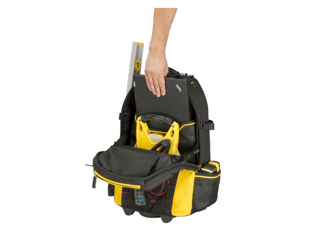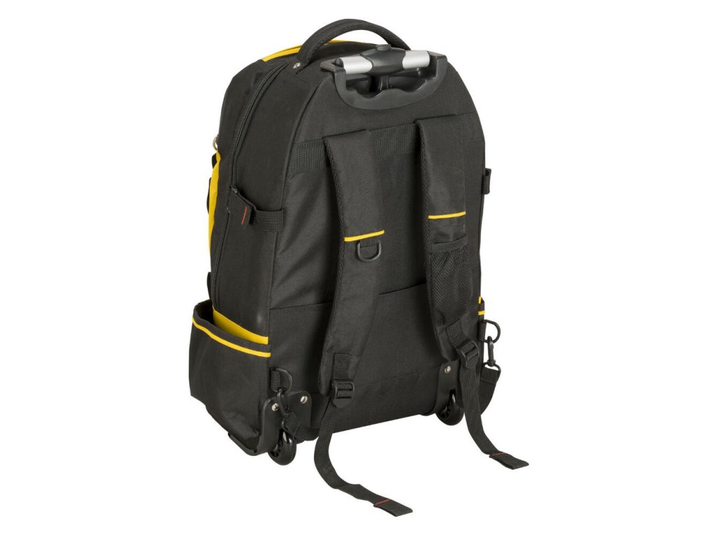 Batoh na náradie STANLEY 1-79-215 FatMax je navrhnutý pre maximálnu mobilitu a organizáciu. Je vyrobený z pevnej a odolnej tkaniny, má kolieska a teleskopickú rukoväť pre ľahkú manipuláciu. Ponúka 50 priehradiek a vreciek a vstrekované polypropylénové dno.