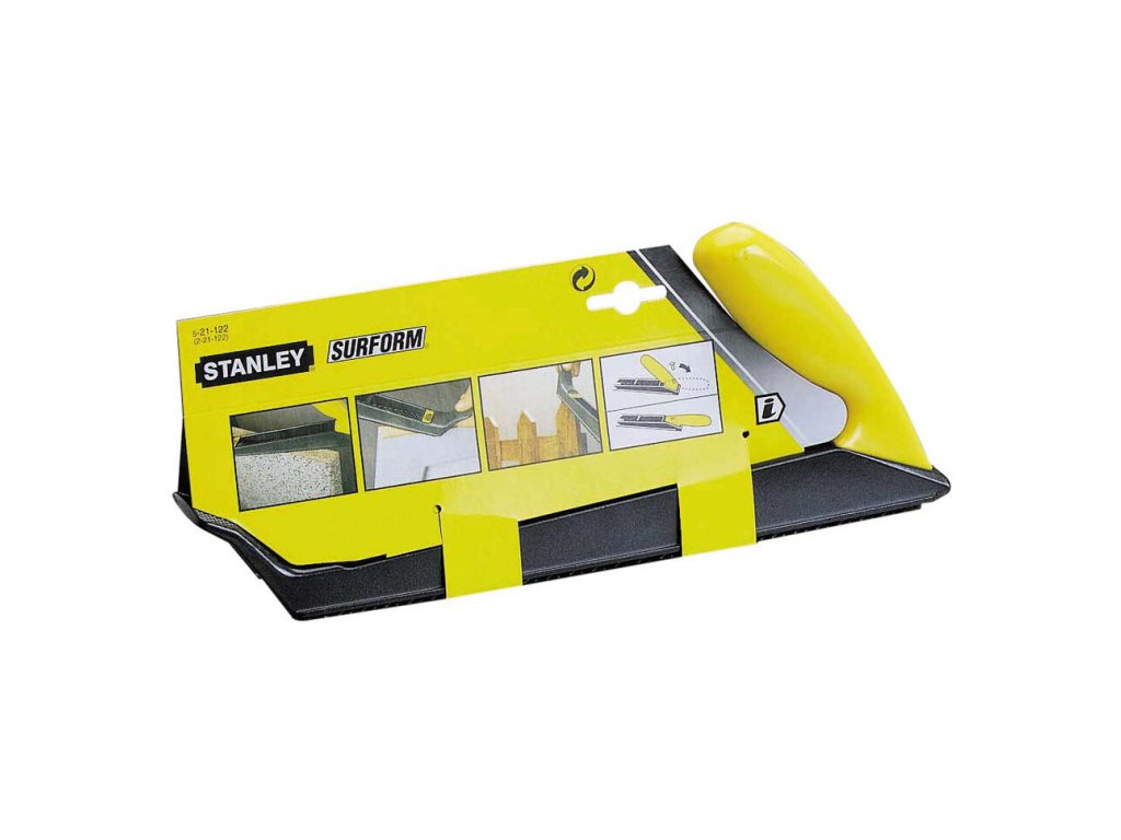 Kovový rašpľový hoblík Stanley 5-21-122 Surform je multifunkčný nástroj s prestaviteľnou konštrukciou, ktorý je možné použiť ako rašpľu alebo ako hoblík. Vstrekovaná plastová rukoväť je nastaviteľná do dvoch polôh (vodorovná pre rašpľu, zvislá pre hoblík). Lakovaný povrch kovového tela chráni pred koróziou. Je kompatibilný so všetkými 250 mm plátkami Surform a dodávaný so štandardným plátkom 21-293.
