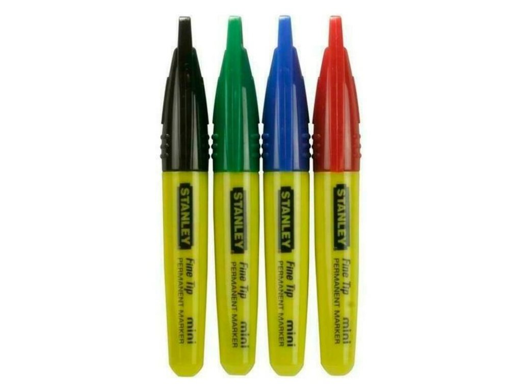 Mini značkovač Stanley. Možnosť 4 farieb: červenú, zelenú, modrú a čiernu. Atrament je permanentný a vodeodolný. Je vhodný na značenie na betón, meď, drevo, kov a ďalšie materiály.