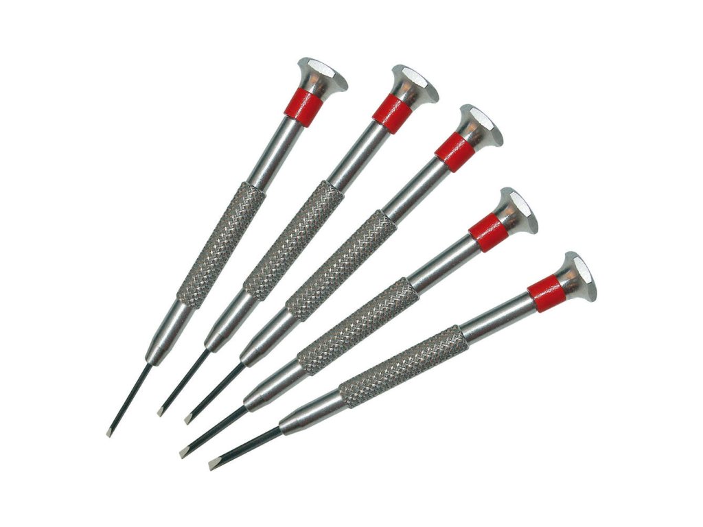 - Sada obsahuje skrutkovače: ploché: 0,8 mm; 1 mm; 1,2 mm; 1,6 mm a 2 mm