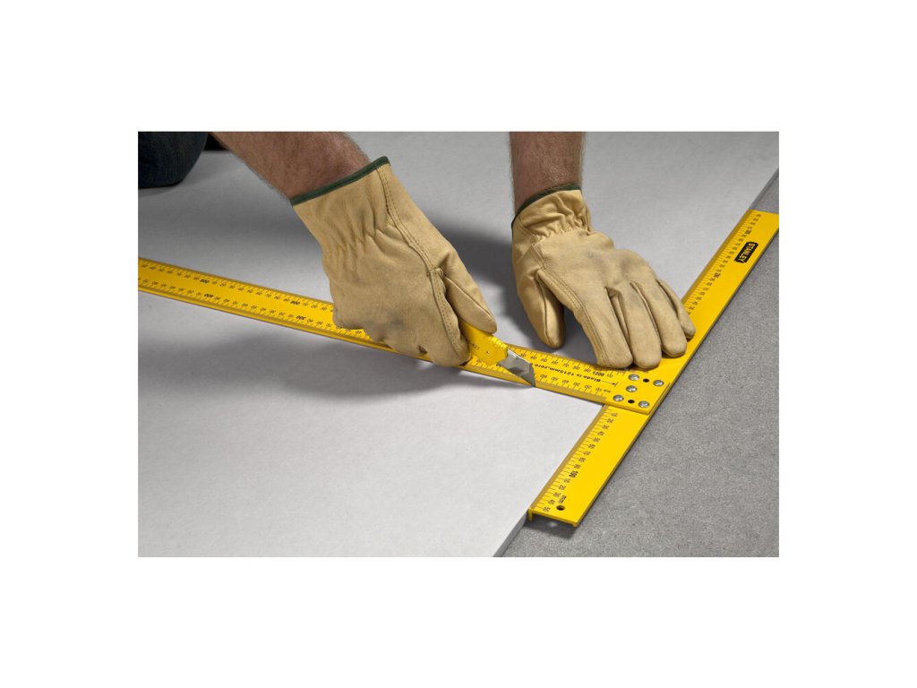 T-uholník STANLEY je základný merací a značkovací nástroj pre prácu s veľkými doskami, sadrokartónom alebo drevenými panelmi. S dĺžkou 1220 mm je ideálny pre presné prenášanie uhlov a línií na materiály so šírkou 1,2 metra.