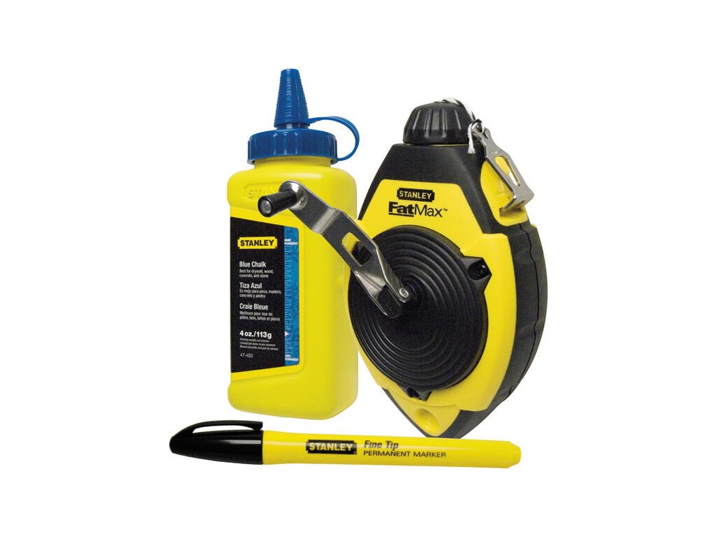 Kompletná sada značkovacej šnúry Stanley FATMAX. Sada obsahuje značkovaciu šnúru FATMAX (30 m), prášok pre značkovaciu šnúru (115 g) a značkovač Stanley.
