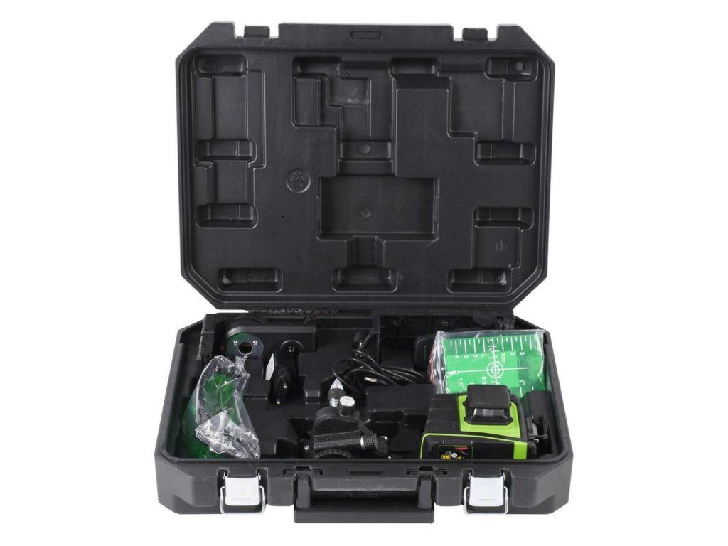 Má až 7 režimov svietenia: 3x360°, 2x 360° (vertikálny 1 a horizontálny), 2x360° (vertikálny 2 a horizontálny), 2x360° (vertikálny 1 a vertikálny 2), 1x 360° (horizontálny), 1x360° (vertikálny 1) a 1x 360° (vertikálny 2). Pracovné režimy: I) Manuálny režim: blikanie každé 3 sekundy - upozorňuje, že teraz nie je samonivelačný. Zobrazuje pravé uhly v akomkoľvek sklone. II) Automatický režim: Samonivelizácia s presnosťou ± 3 mm/10 m. Automatický režim pulzný - pre prácu s detektorom. Merací rozsah tohto laseru je 30 m bez detektora, s detektorom 50 m. Napájanie: 5,2 Ah Li-ion batéria. Súčasťou balenia je 5,2 Ah Li-ion batéria, nabíjačka, statív, magnetický držiak, univerzálny držiak, terčík, kufrík, okuliare..