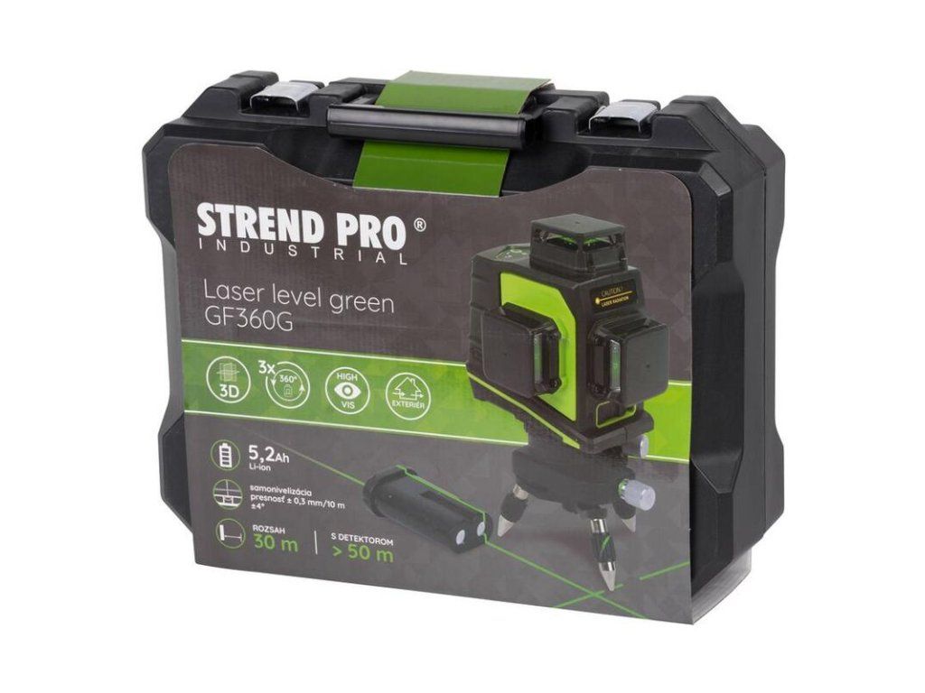 Laser Strend Pro GF360G 3D so zelenou laserovou diódou nemeckej značky OSRAM 520 Nm. Vlnovú dĺžku tejto farby dokáže ľudské oko zachytiť najlepšie, čiže má aj najjasnejší lúč v porovnaní s ostatnými farbami. Použitie: zarovnávanie dlaždíc, skríň, líšt a obrúb, pokladanie podláh, stavby priečok, montáž sadrokartónov, montáž dverí a okien, zladenie polôh vŕtania a práce v domácnosti (vešanie obrazov, políc).