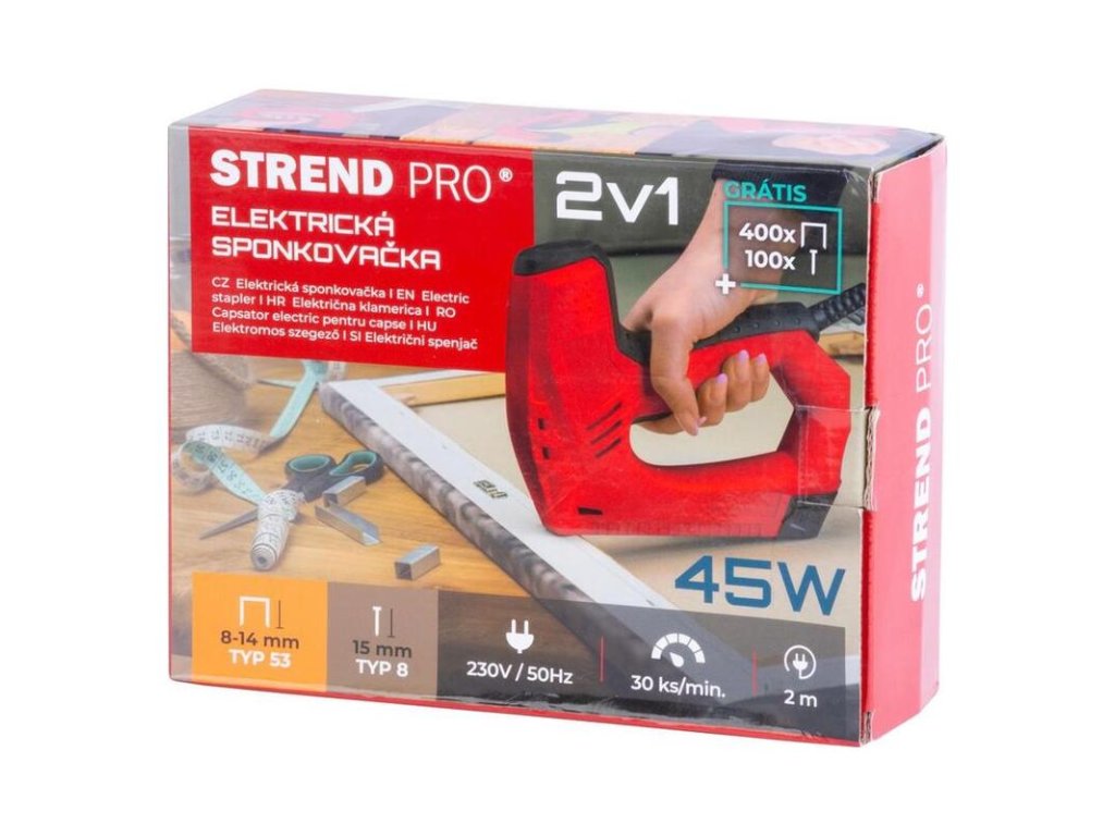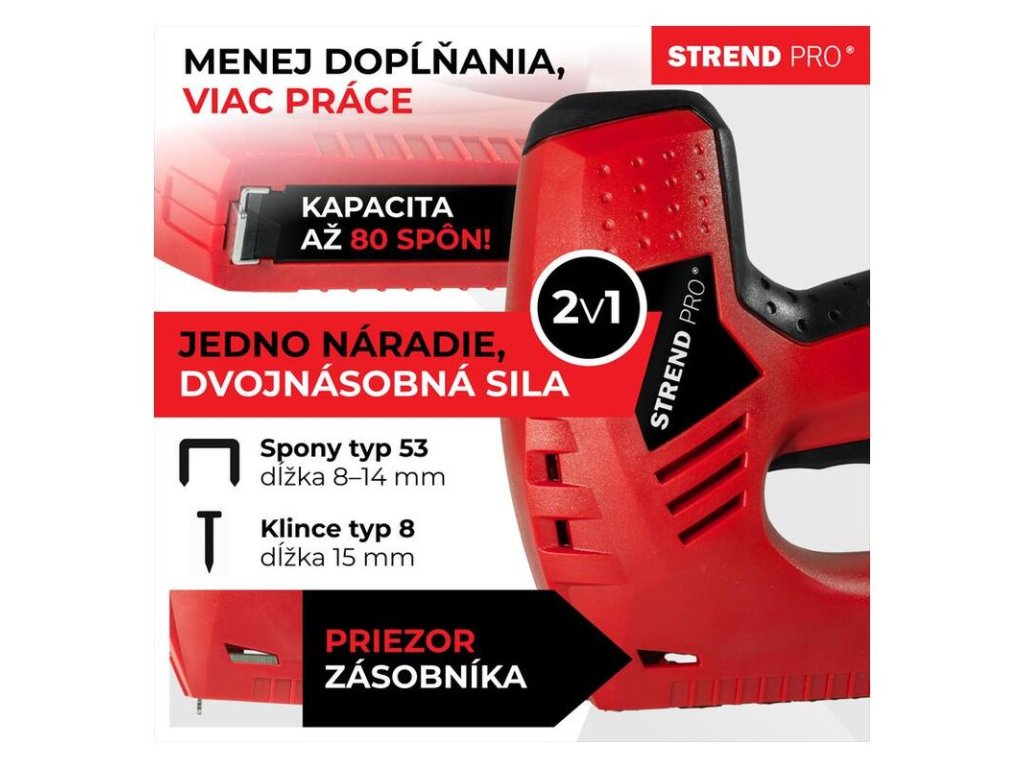 Elektrická sponkovačka Strend Pro je šikovný pomocník pre každého domáceho majstra ako aj do tvorivej dielne. Je ideálna pre čalúnenie nábytku, na dekorovanie, upevňovanie tenkých drevených materiálov, na renovačné práce. Sponkovačka má 2 funkcie - nastreľovanie klincov a zošívanie sponkami. Je vybavená ukazovateľom stavu naplnenia a bezpečnostnou poistkou, ktorá chráni používateľa pred samovoľným vystrelením. Kadencia spôn/klincov za minútu: 30. Vhodná pre sponky typu 53 od 8-14 mm a klince typu 8 15 mm. Kapacita zásobníka: 80.