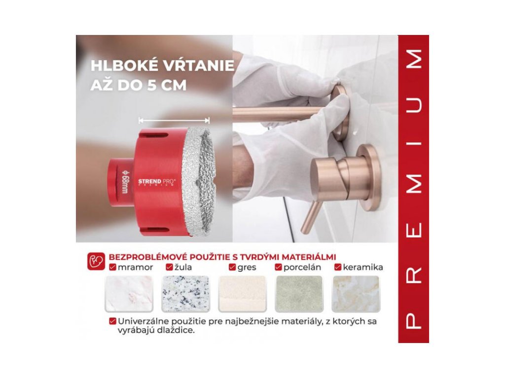 Vyrezávač Strend Pro Premium je vhodný na vyrezávanie všetkých druhov tvrdeného kameňa a jeho zlúčenín, keramických dlaždíc, mramoru, gresu, porcelánu a žuly. Špičkový proces spájania diamantov zabezpečuje vysokú odolnosť voči vysokým teplotám a predlžuje životnosť. Extrémne ľahké rezanie a vysoká výkonnosť pri vykružovaní. Perfektne ho využijete pri montáži kúpeľnovej sanity a príslušenstva, inštalácii káblov, elektrického vedenia, radiátorov atď. Je použiteľný s akoukoľvek vŕtačkou s použitím vhodného adaptéru. Typ upínania: M14, Ø vyrezávača je 68 mm.