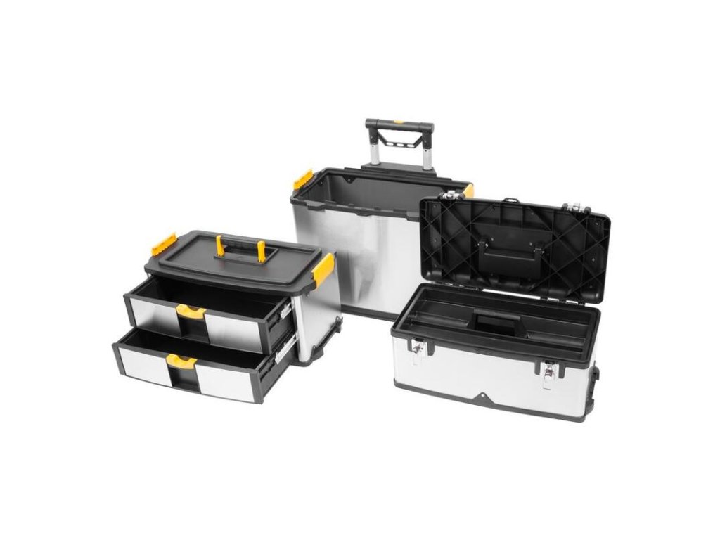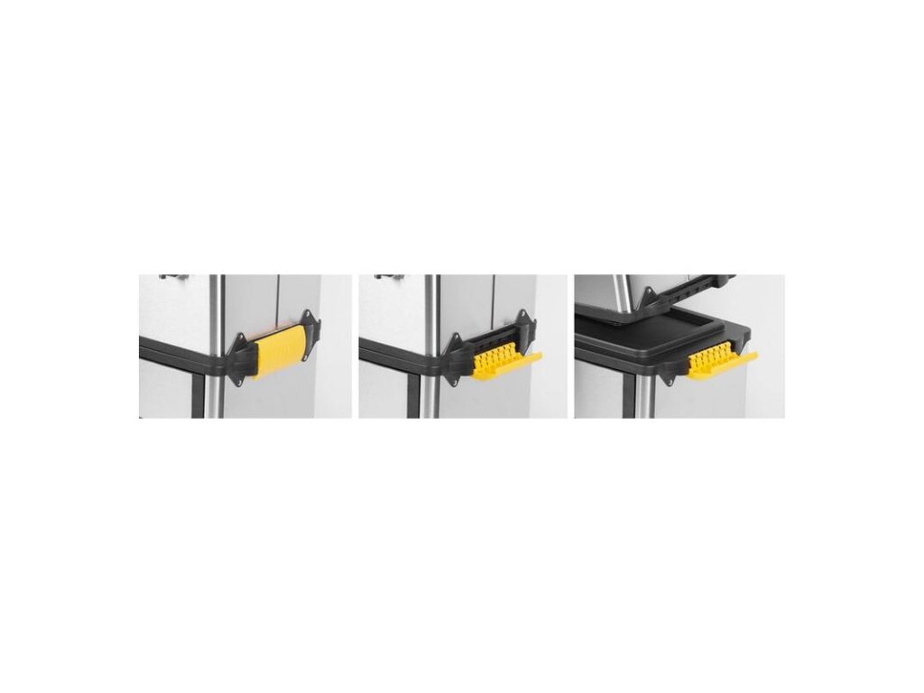 Kovoplastový box Stanley so zásuvkou na ukladanie elektrického náradia. Má ergonomickú rukoväť a plastové pracky s okami pre visací...
