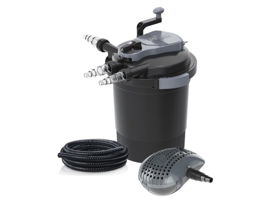 Tlaková filtračná súprava je určená pre jazierka do 10 m³ bez rýb, 5 m³ s rybami, 2,5 m³ s koi kaprami. Čerpadlo stačí umiestniť do jazierka a pripojiť ho k filtru pomocou hadice. Filter má integrovanú UV lampu proti riasam, voda prechádza cez filtračné médiá a je mechanicky a biologicky upravovaná. Filter má tri hadicové prípojky, na vstup, výstup a čistenie. Je možné napájať potok alebo vodopád až do výšky 1,5 m.