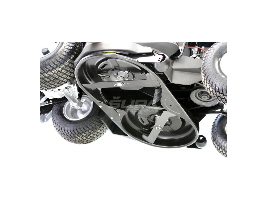 Stroj je vybavený hydrostatickou prevodovkou Hydro Gear, ktorá umožňuje plynulú zmenu rýchlosti bez nutnosti radenia. Dva časované nože sú ovládané pohodlnou elektromagnetickou spojkou a zabezpečujú kvalitný zber do 240-litrového koša. Robustný nosný rám s integrovaným nárazníkom chráni traktor pred poškodením v náročnejšom teréne.