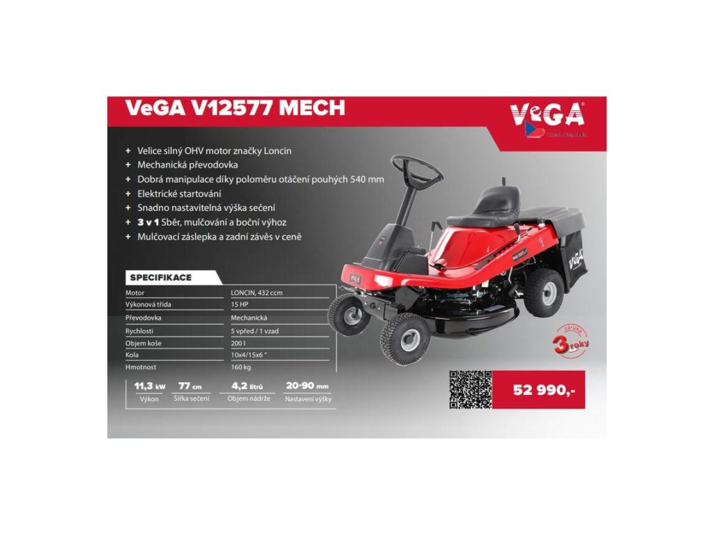 VeGA V12577 MECH je kompaktný, no prekvapivo výkonný záhradný traktor (rider), ktorý sa zmestí aj do menších záhrad, ale silou motora konkuruje veľkým strojom. Je vybavený motorom Loncin s výkonom 15 HP, čo je v kategórii riderov so záberom 77 cm nadštandard. Tento model využíva jednoduchú a odolnú mechanickú prevodovku s 5 rýchlosťami vpred a 1 vzad.