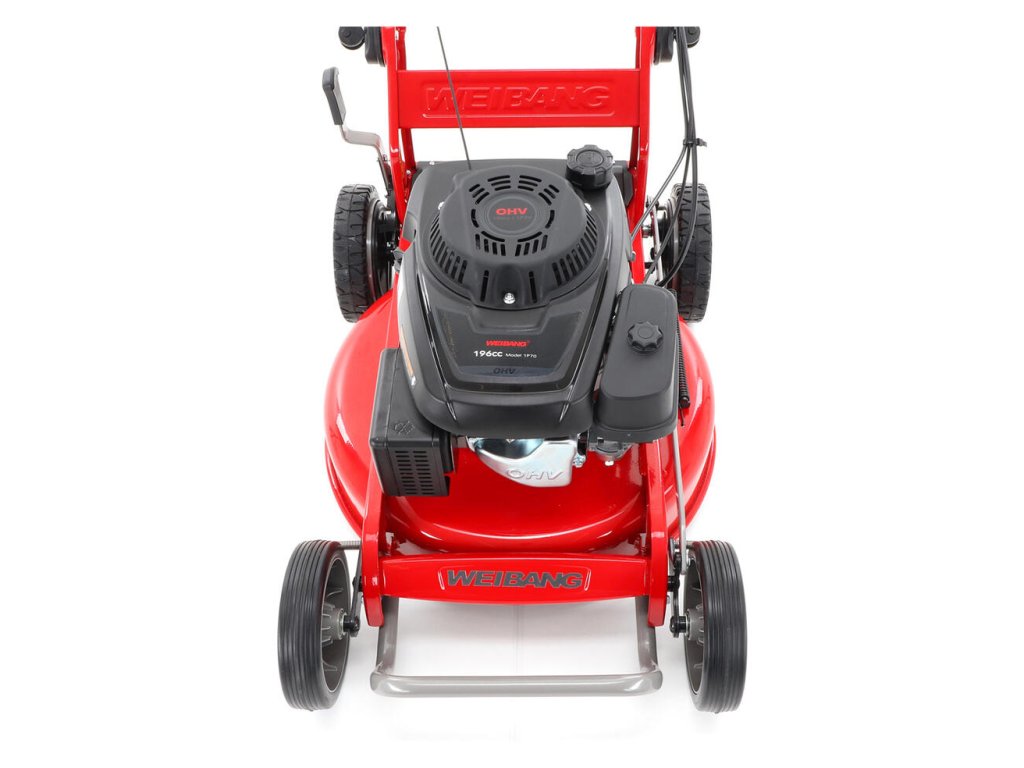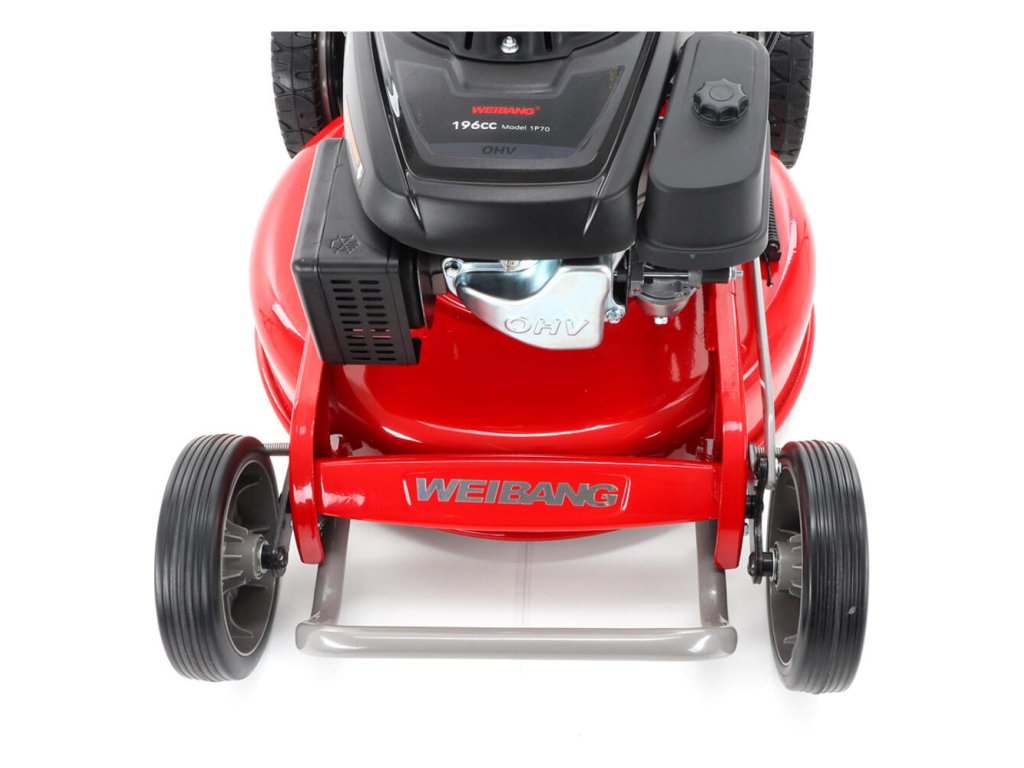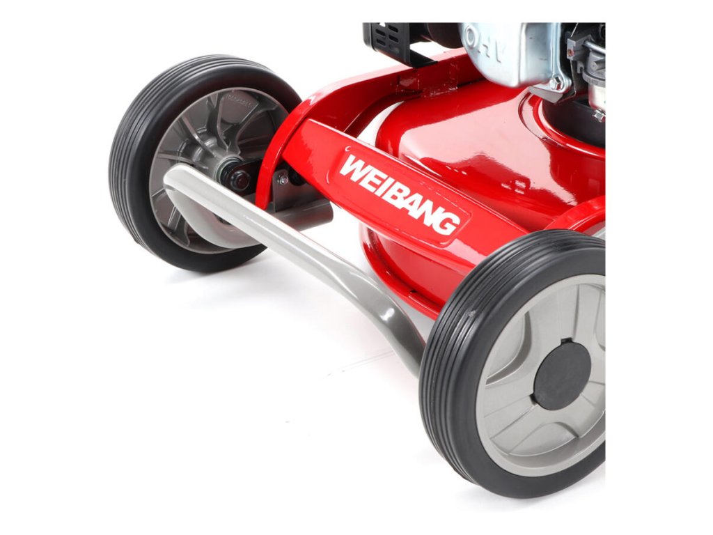 Táto funkcia môže eliminovať poškodenie kosačky spôsobené nárazom noža do prekážky. Okrem toho je táto kosačka vybavená pevnými zadnými kolesami a sklopnou rukoväťou pre ľahké skladovanie a prepravu. Ďalšou jedinečnou vlastnosťou je motor, ktorý je jedným z najlepších a najvýkonnejších, aké WEIBANG ponúka v tejto triede. Ide o profesionálny, veľmi výkonný OHV motor s výkonom 7 HP a vysokým krútiacim momentom 10,5 Nm - 196 ccm.
