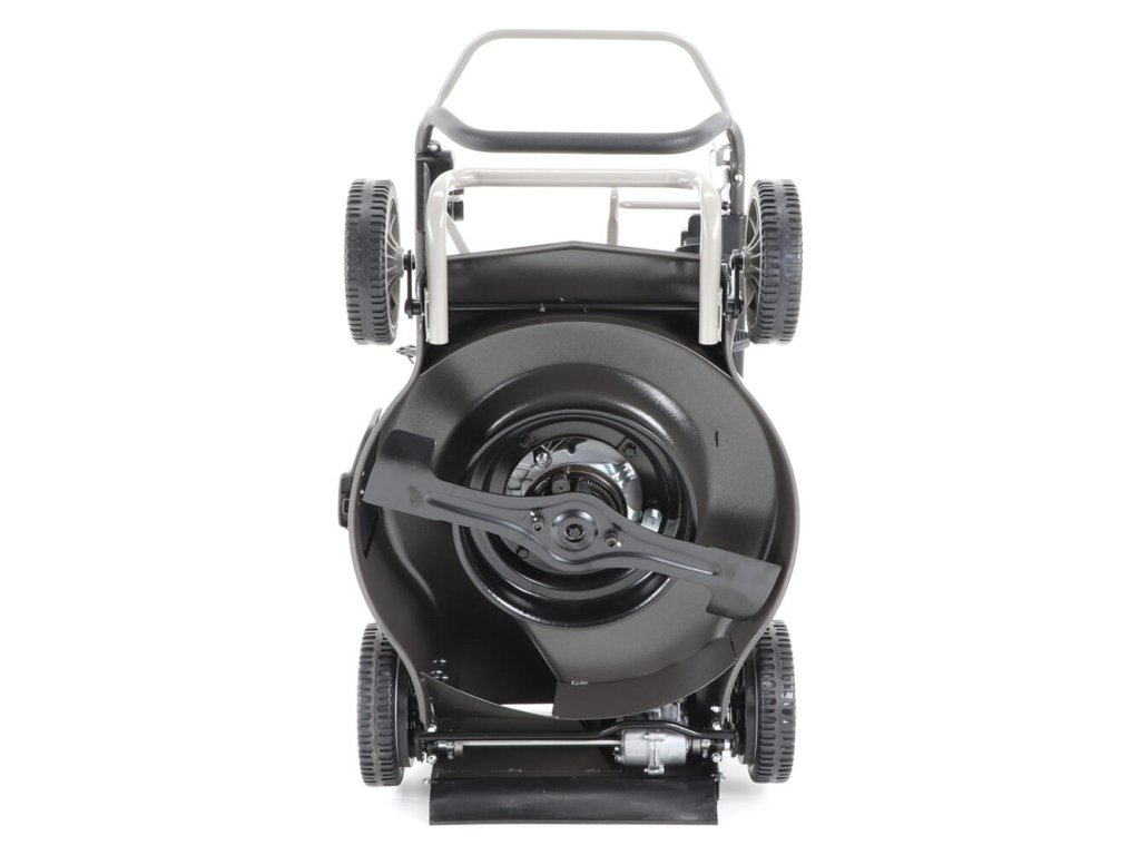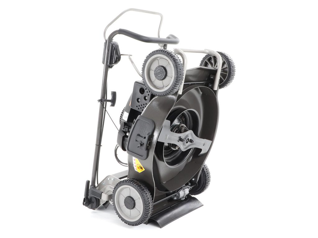 Novinkou kosačky je funkcia „SMART SOLUTION“, ktorá umožňuje kosačku otočiť a umiestniť na špeciálne zadné podvozkové nohy pre úsporné skladovanie, ľahké čistenie a servis, čím získate ľahký prístup k spodnej strane kosačky, ložiskám náprav a prevodovke.