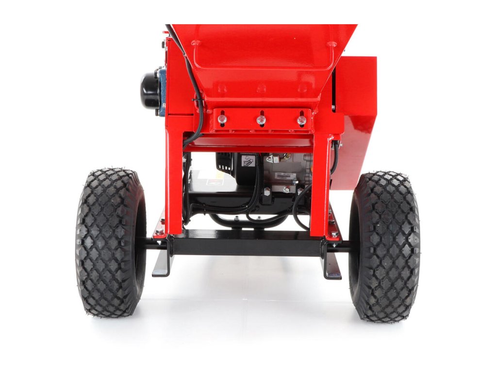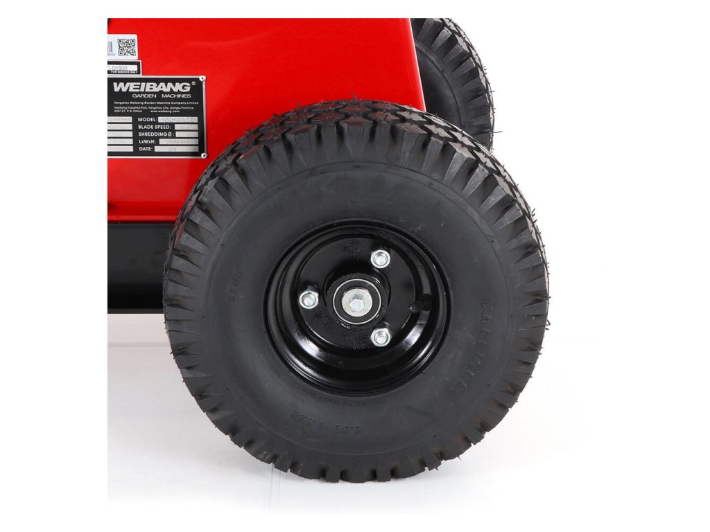 Veľké kolesá s priemerom 350 mm na ložiskách zabezpečujú ľahkú manipuláciu a stabilitu aj na nerovnom teréne. Vďaka robustnej konštrukcii a hmotnosti 205 kg je tento drvič mimoriadne odolný a vhodný na profesionálne použitie v záhradníctve, lesníctve alebo na farmách.