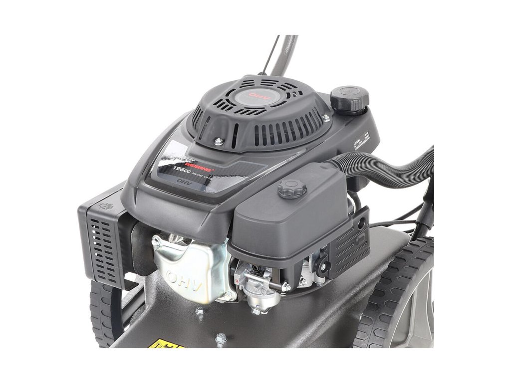 Kosačka je vyrobená z vysoko kvalitnej ocele, čo zaručuje jej dlhú životnosť a odolnosť aj v náročných podmienkach. Pracovná šírka 559 mm je ideálna na rýchle pokosenie veľkých plôch. Výška kosenia sa dá nastaviť v rozmedzí 5–13 cm, čo umožňuje flexibilitu pri rôznych typoch terénu a vegetácie. Kosačka používa nylonovú strunu s priemerom 4,5 mm, ktorá ľahko zvládne trávu aj náročnejšiu vegetáciu.