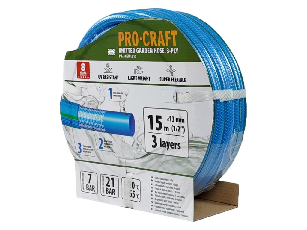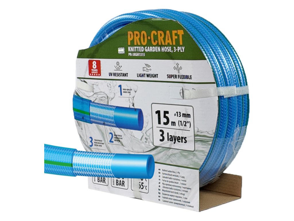 Hadica Procraft PR-3KGH1315 je vyrobená z PVC materiálu vystuženého kvalitnou tkaninou, čo zvyšuje jej odolnosť a pevnosť. Tieto vlastnosti zabezpečujú, že hadica odolá mechanickému poškodeniu a poskytuje dlhodobý servis.
