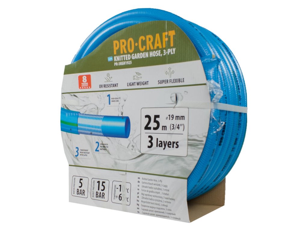Hadica ProCraft PR-3KGH1925 je vyrobená z troch vrstiev, ktoré poskytujú dodatočnú ochranu a odolnosť voči mechanickému poškodeniu. Tieto vrstvy sú navrhnuté tak, aby zabezpečovali optimálnu pružnosť a pevnosť, čo ju robí ideálnou pre intenzívne používanie.