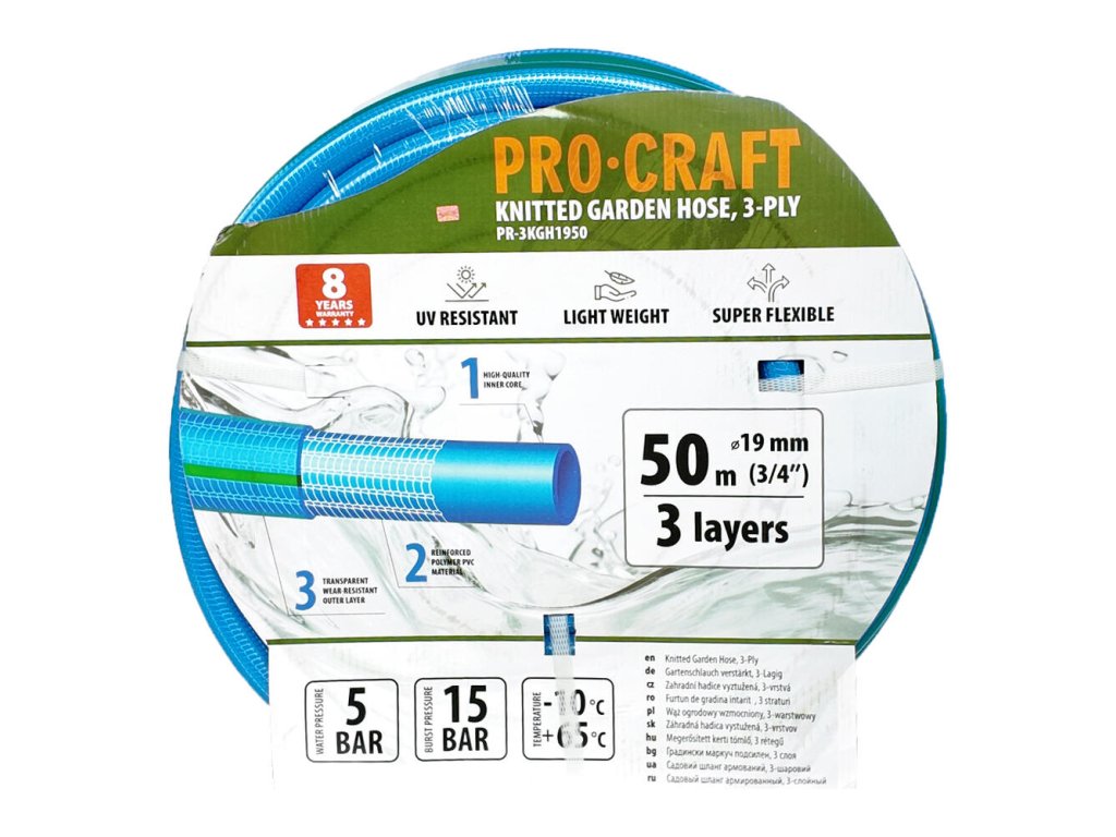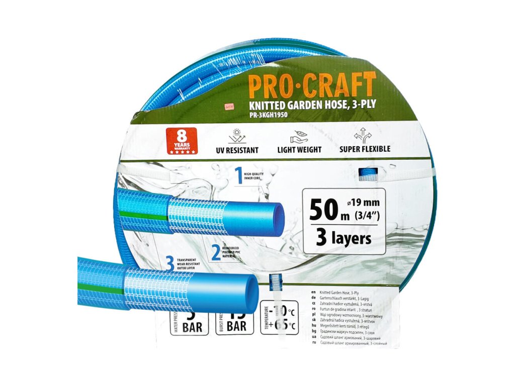 Bez ohľadu na to, či ju používate v horúcom lete alebo chladnej zime, hadica ProCraft PR-3KGH1950 zostáva funkčná a odolná voči poškodzovaniu.