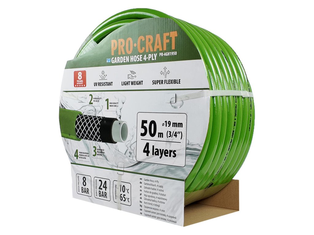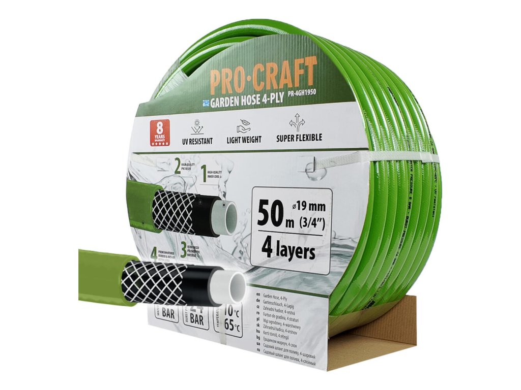 Záhradná hadica ProCraft PR-4GH1950 bola navrhnutá pre všetkých, ktorí si cenia kvalitu a spoľahlivosť pri práci na záhrade. Táto hadica je špeciálne určená na zavlažovanie a polievanie záhrad, poskytujúc dlhú životnosť a vysoko odolnú konštrukciu. Je vyrobená z kvalitných materiálov, ktoré zabezpečujú maximálnu odolnosť voči UV žiareniu, poveternostným vplyvom a extrémnym teplotám od -10°C do +65°C. Vďaka svojej pružnosti a pevnosti, táto hadica je ideálnou voľbou pre každého záhradkára.