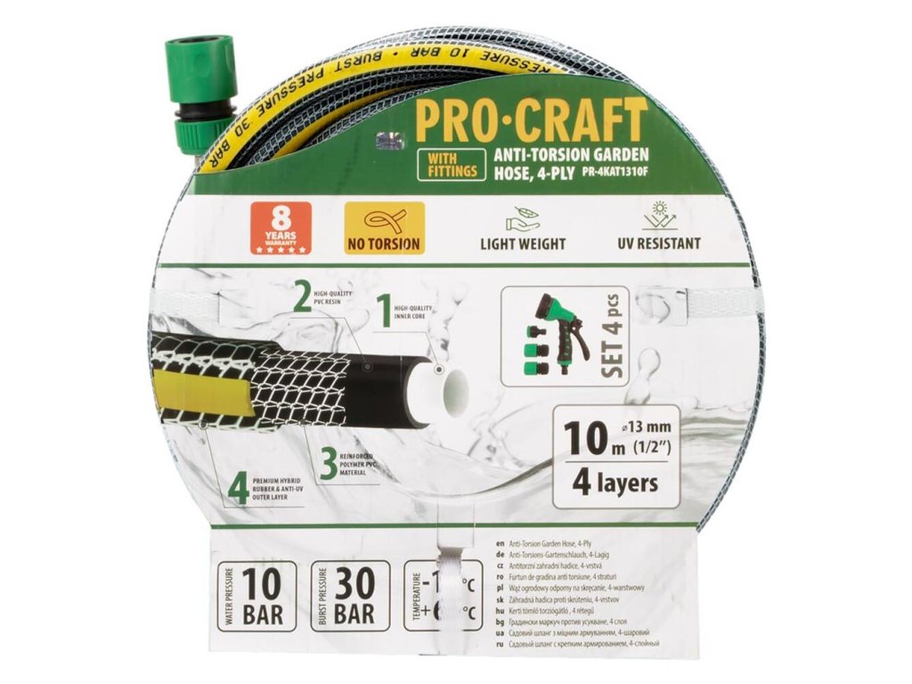 Záhradná hadica ProCraft PR-4KAT1310F je navrhnutá tak, aby zvládla tie najnáročnejšie záhradkárske úlohy. S dĺžkou 10 metrov a priemerom 1/2" poskytuje dostatočnú flexibilitu a kapacitu na efektívne zalievanie. Vďaka inovatívnej 4-vrstvovej konštrukcii je hadica odolná voči tlaku a UV žiareniu, čím zaručuje dlhú životnosť aj pri náročných podmienkach.