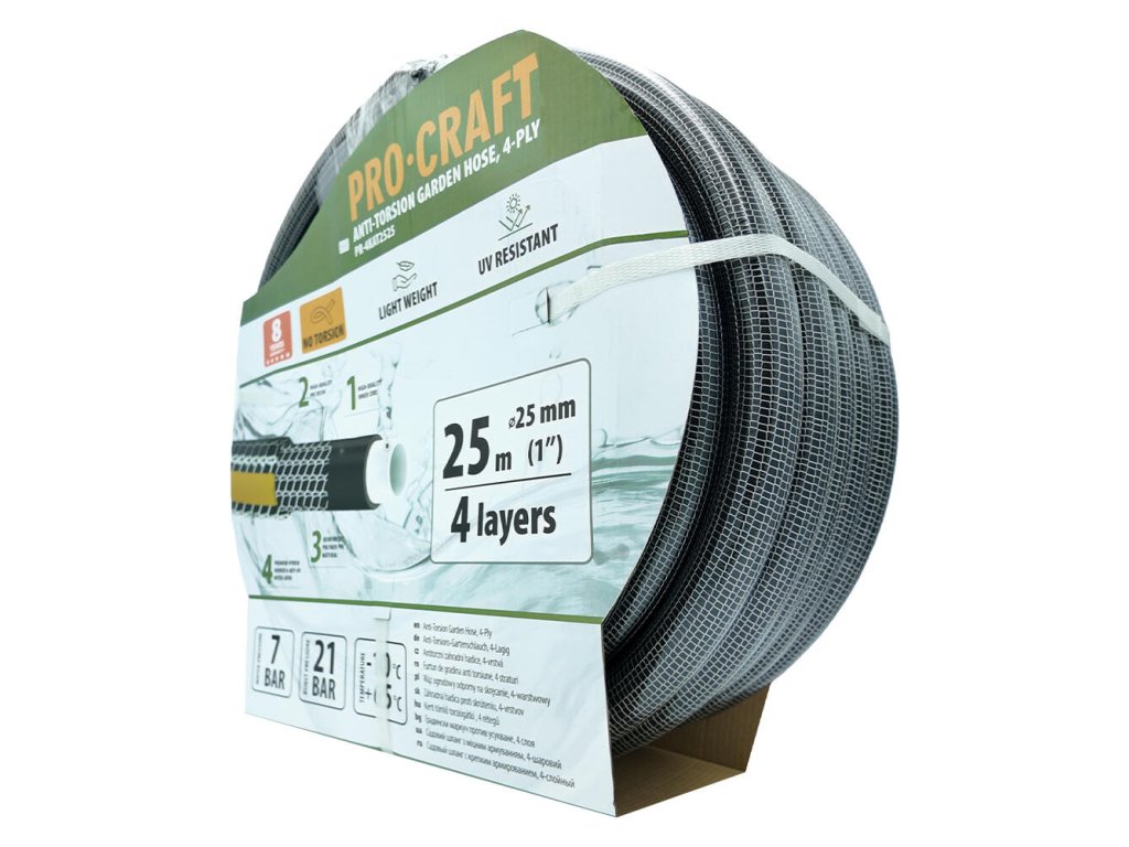 Hadica ProCraft PR-4KAT2525 je 4-vrstvová, čo jej poskytuje mimoriadnu odolnosť voči tlaku a rozmerovú stabilitu. Táto viacvrstvová konštrukcia tiež zaručuje, že hadica zostáva pružná, aj keď je vystavená extrémnym teplotám alebo poveternostným vplyvom.