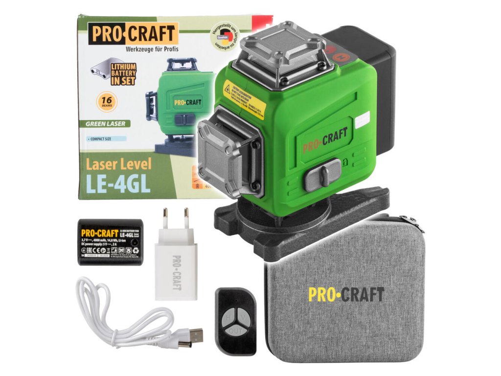Procraft LE-4GL je výnimočný nástroj pre profesionálne a presné meranie v stavebníctve a interiéroch. Tento výkonný zelený čiarový laser je navrhnutý tak, aby poskytoval maximálnu presnosť a efektivitu, pričom s 360° uhlom lúča a 16 laserovými paprskami zabezpečuje úplné pokrytie pracovnej plochy. Vďaka svojim inovatívnym funkciám je ideálnym riešením pre náročných používateľov, ktorí vyžadujú presnosť a spoľahlivosť.