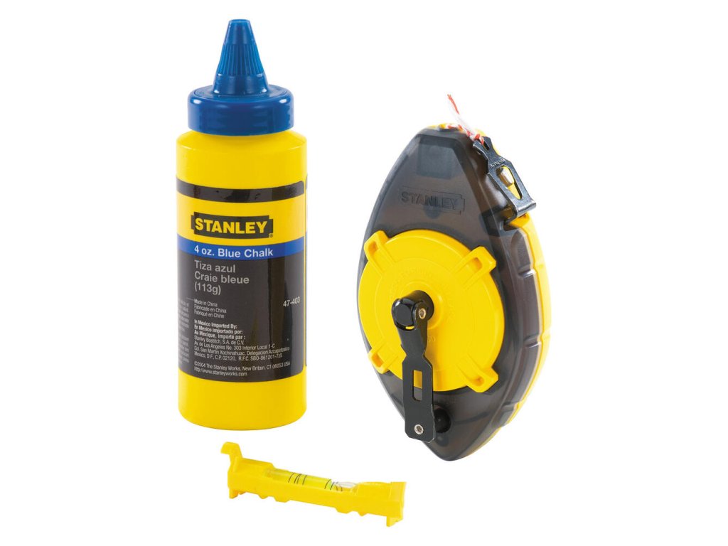 Kompletná súprava **značkovacej šnúry Stanley FATMAX** vrátane modrého prášku. S prevodom 5:1 je navíjanie šnúry rýchle a efektívne. Odolné bimateriálne puzdro a dlhá 30-metrová šnúra zaisťujú spoľahlivú prácu na stavbe pri vyznačovaní rovných čiar.