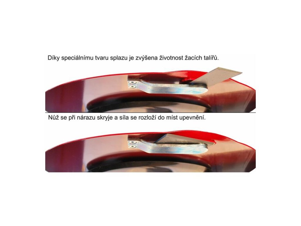 Tento žací tanier je vybavený 3 nožmi, ktoré sa pri náraze do pevnej prekážky (kameň, peň) bezpečne sklopia, čím sa sila rozloží do upevnenia a nedôjde k deformácii hriadeľa. Spevnenie v mieste uloženia nožov pomocou navarených veľkoplošných podložiek zaručuje, že tanier zvládne aj profesionálne nasadenie v náročných podmienkach.Hlavné vlastnosti a výhody zostavy taniera