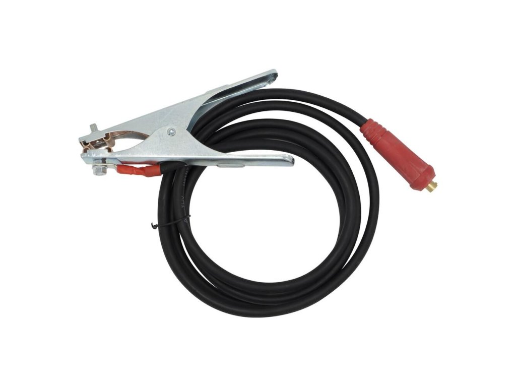 Balenie obsahuje zvárací štít, kábel s držiakom elektródy, kábel s uzemňovacími kliešťami a drôtenú kefu kombinovanú s kladivom na trosku.
